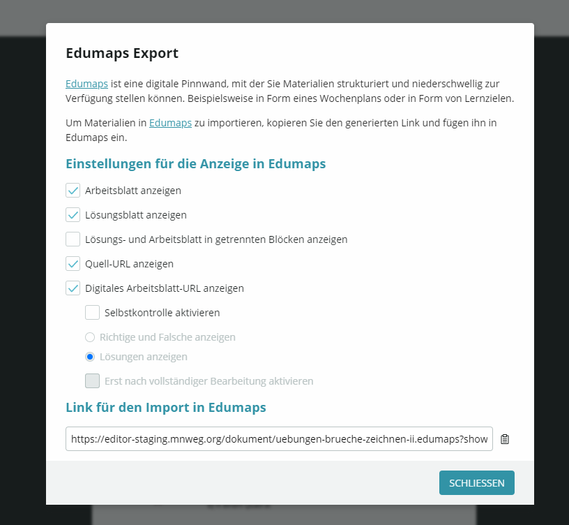 Klicken Sie auf „Edumaps Export“, so erscheint ein Export-Dialog mit Einstellmöglichkeiten: