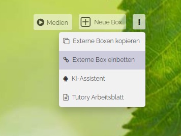 Um eine externe Box von einer anderen Map einzubetten, klicken Sie auf die drei Punkte rechts neben dem Button „Neue Box“. Daraufhin öffnet sich ein Dropdown. Wählen Sie dort „Externe Box einbetten“.