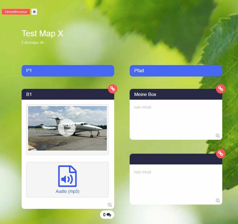 In der Mapansicht erkennen Sie den aktiven Einbettmodus an den rot-weißen Link-Symbolen an den Boxen sowie an dem kleinen roten Banner „Einbettmodus“ links oben.